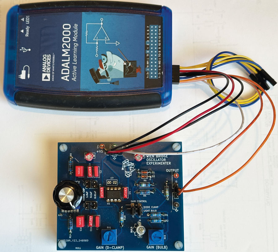 Note the initial transient, where the circuit is searching for just the right amplitude to sustain oscillation. While this circuit may be built up on a breadboard, if you have made it this far into the exercise, you might want to have something a bit more reliable and permanent. Figure 8 shows the completed PCB with the ADALM2000 connected.
