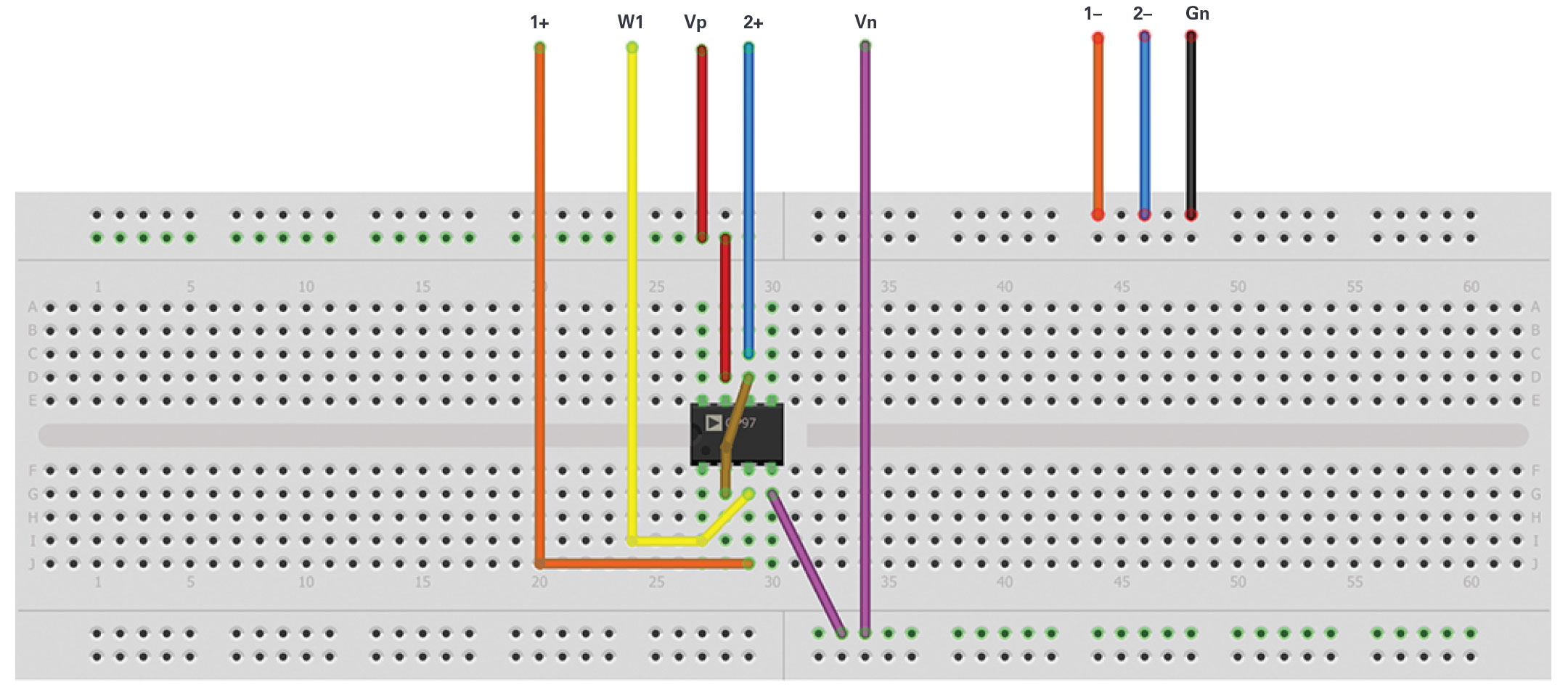 Insert the op amp into your breadboard and add the wires and supply capacitors, as shown in Figure 1. To avoid problems later, you may want to attach a small label to the breadboard to indicate which rails correspond to +Vp, –Vn, and ground. Color coding your wires red for Vp, black for Vn, and green for ground can also help to keep the connections organized.