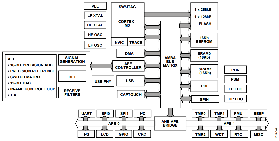 The ADuCM350 is a complete, coin cell powered, high precision, meter-on-chip for portable device applications, such as point-of-care diagnostics and body-worn vital signs monitoring devices.