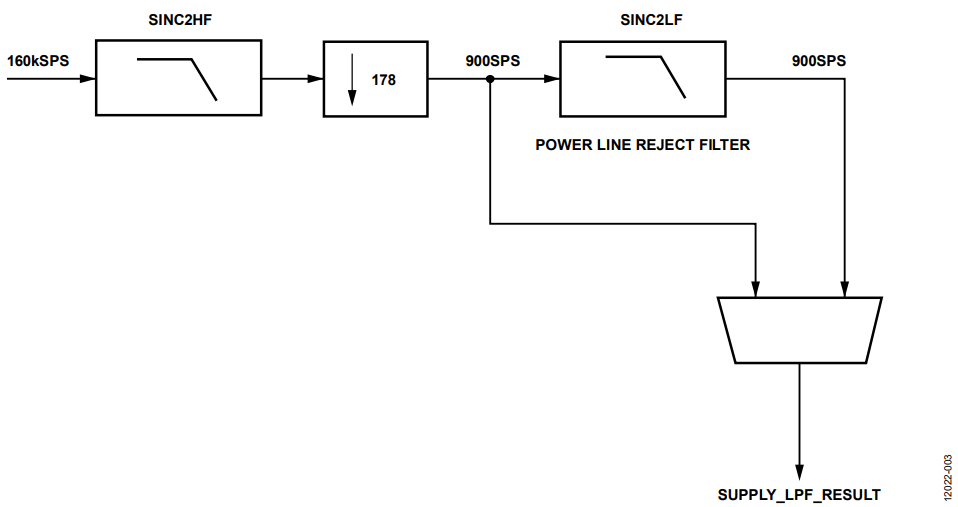 The sinc2hf filter decimates the 160 kSPS input data by 178 for a target output data rate of 900 Hz. The reason behind choosing 900 Hz was to allow the optimal placement of the 50 Hz and 60 Hz notches.