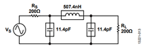 For example, if the in-band ripple needs to be 0.1 dB, the 3 dB cutoff frequency is 100 MHz. At 250 MHz the rejection needs to be 28 dB, the frequency ratio is 2.5. A third-order low-pass filter can meet this requirement. If the source impedance of the filter is 200 Ω, the load impedance of the filter is also 200 Ω, RS/RL is 1; use a capacitor as the first component. Then the user receives a normalized C1 = 1.433, L2 = 1.594, C3 = 1.433, if the fc is 100 MHz, use Equation 7 and Equation 8 to finalized results: