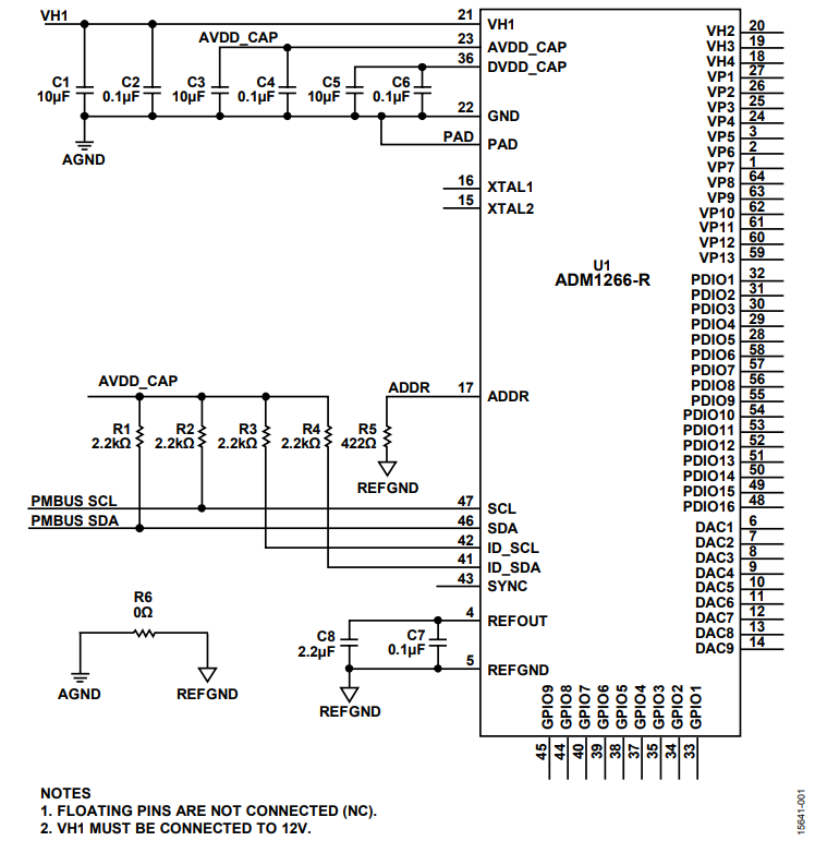 Figure 1 shows the recommended pin settings for the ADM1266 for a mass programming environment, only. It is recommended that all components used in the hardware setup are surface-mount components.