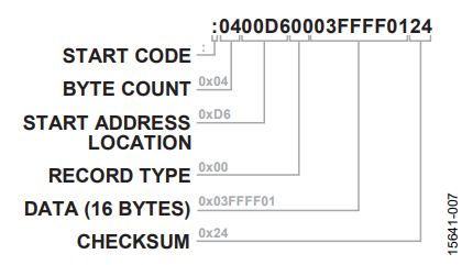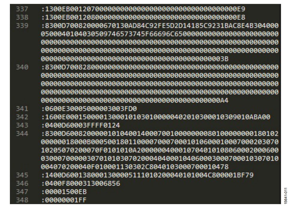 The end of the .hex file is represented by :00000001FF. The PMBus write type is based on the byte count, such as 1 byte results in a byte write, 2 bytes result in a word write, and 3 or more bytes result in a block write.