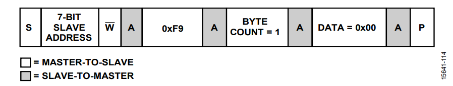 The ADM1266 must be placed in bootloader mode before the firmware can be programmed. The ADM1266 can be placed in bootloader mode by writing 0x02, 0x00, and 0x00 to the UPDATE_ FW command (Register 0xFC) as a group command, as shown in Figure 7.