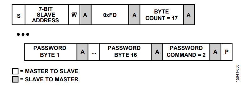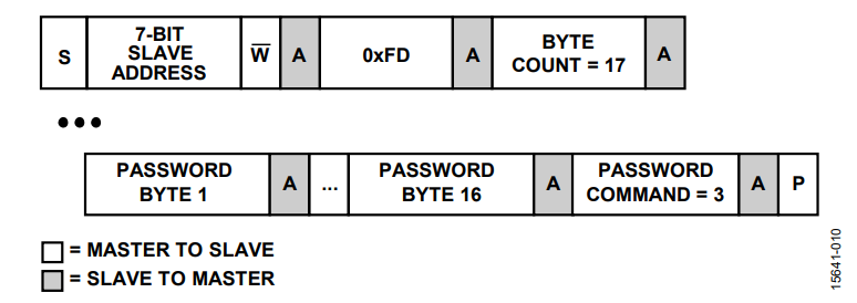 The ADM1266 can be unlocked by performing two consecutive writes of the correct password to the FW_PASSWORD command (Register 0xFD). The block write command to unlock the ADM1266 is shown in Figure 6. The default password is 0xFF for the first 16 bytes, and the 17th byte (password command) is set to 0x02.