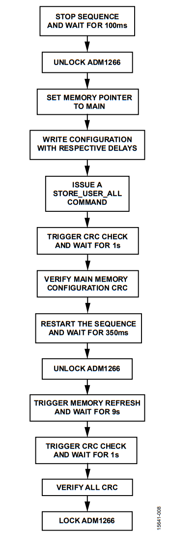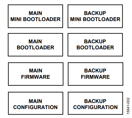 The ADM1266 contains backup memory sections for the mini bootloader, bootloader, firmware, and configuration. After the firmware and configuration are successfully programmed, trigger memory refresh. Memory refresh copies the main memory content to the backup memory, and the backup memory to the main memory.