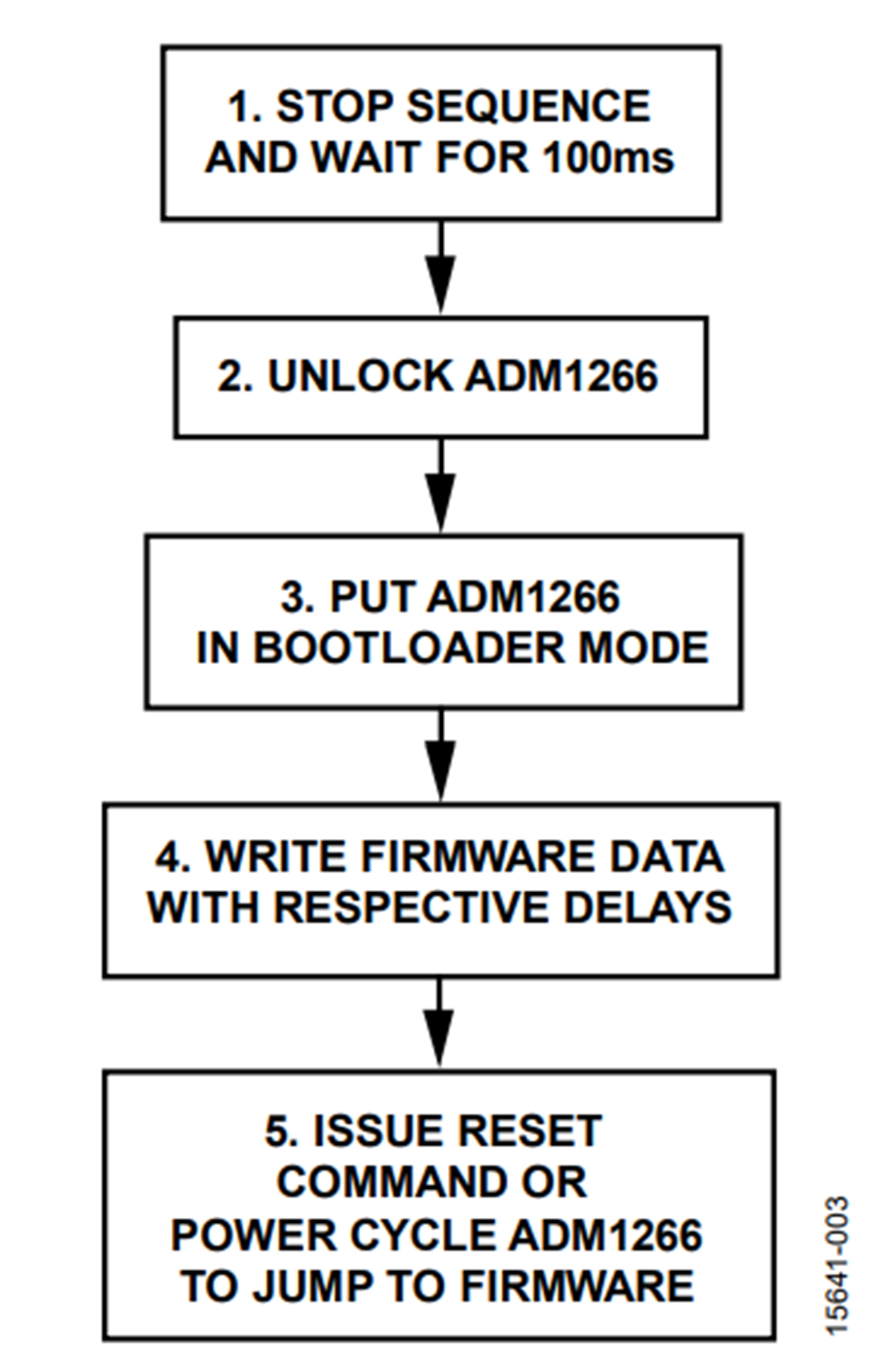 The ADM1266 is powered up in bootloader mode and stays in bootloader mode if no firmware is present. As shown in Figure 4, only Step 4 and Step 5 are required to load the firmware.