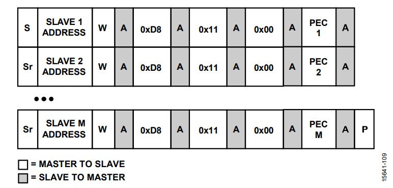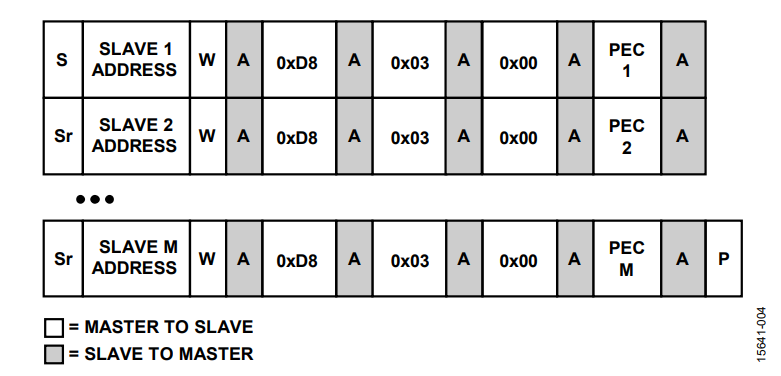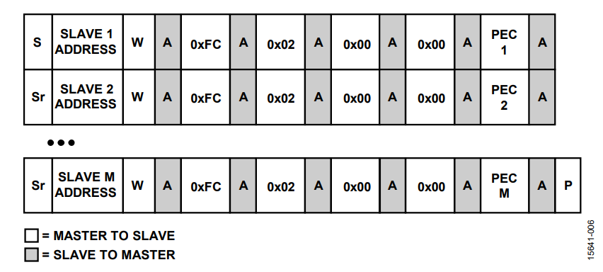When the new configuration data is written to the ADM1266, the new sequence can be run by writing 0x0000 to the GO_ COMMAND command (Register 0xD8) as a group command to restart the sequence in multiple ADM1266 devices simultaneously. The group command protocol is shown in Figure 5.
