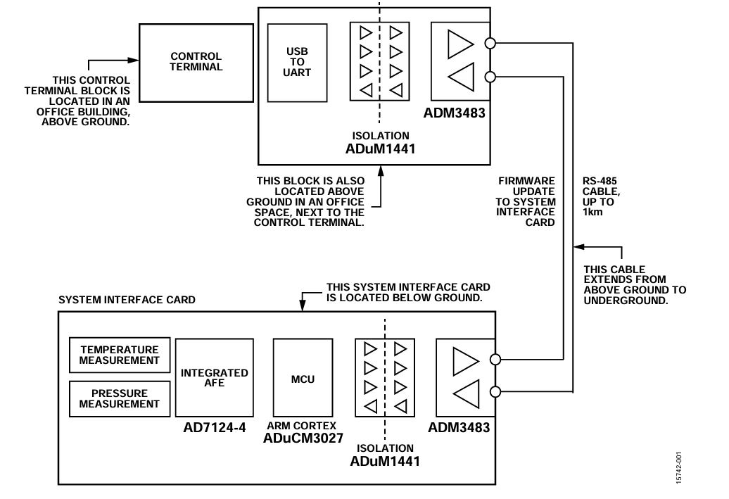 Figure 1 shows an isolated, robust, low power RS-485 solution for downhole applications. The ADM3483 and ADuM1441 together provide a robust low power link to the remote underground measurement node. The system interface card includes an ARM® Cortex® microcontroller unit (MCU), ADuCM3027, and an integrated analog front end (AFE), AD7124-4, for remote temperature and pressure measurements. Firmware updates to the system interface card are provided via the long distance RS-485 cabling, which is capable of low data rate transmission (for example, 9.6 kbps) over long distances of up to 1 km.