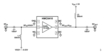 Figure 1 shows the HMC8410, a low noise RF amplifier that operates from 10MHz to 10GHz. It requires a drain current, set by the negative gate voltage, to turn on. The application schematic shown in Figure 1 has a positive drain voltage that is applied through an inductor to the RFOUT/VDD pin. A negative gate voltage is applied directly to the RFIN/VGG1 pin via an inductor. The negative gate voltage is adjusted to set the desired drain current. To avoid excessive drain current and burnout, the negative gate bias voltage must be applied before the drain voltage.