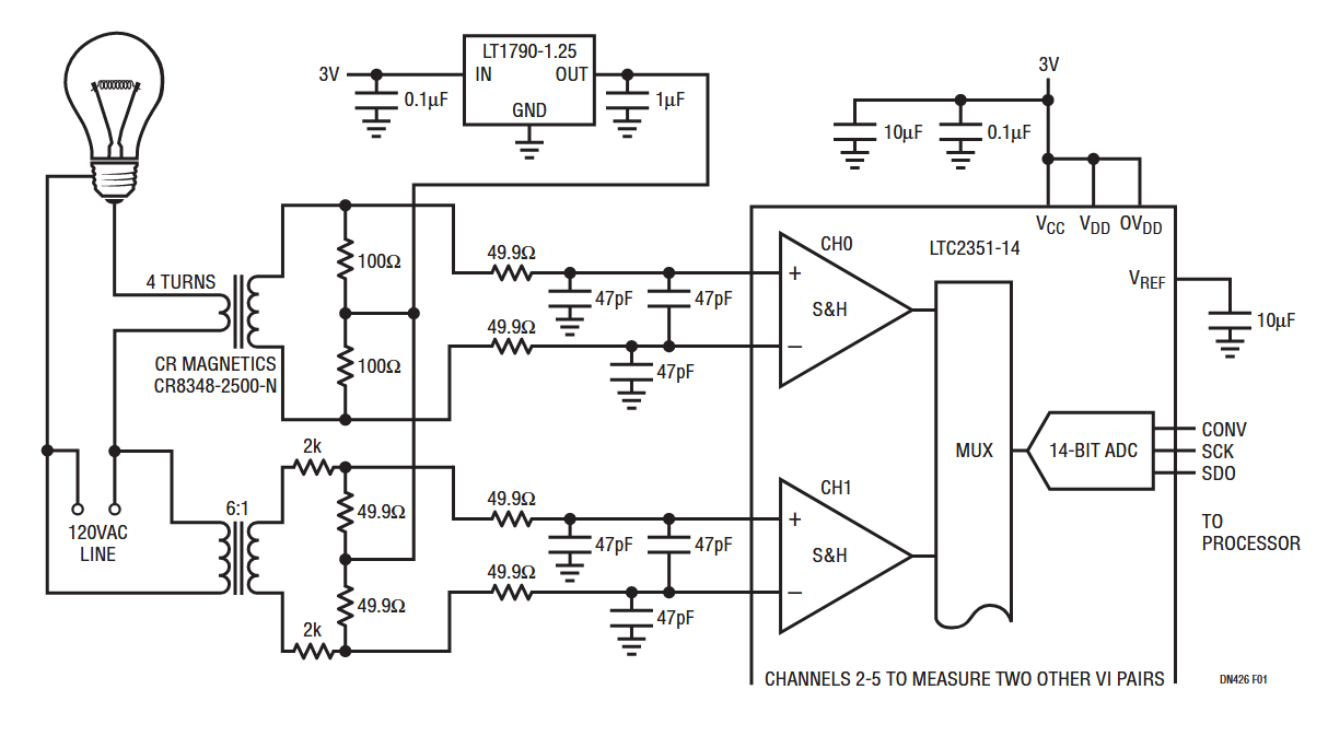 Figure 1 shows a typical power line monitoring application. Current is sensed by a CR Magnetics CR8348-2500-N current transformer. An LT1790-1.25 biases the output of the transformer to the middle of the LTC2351-14 input range, giving the inputs maximum swing. A 6:1 transformer and 41:1 attenuator scale the line voltage, and the transformer output is similarly biased.
