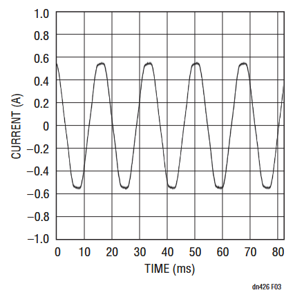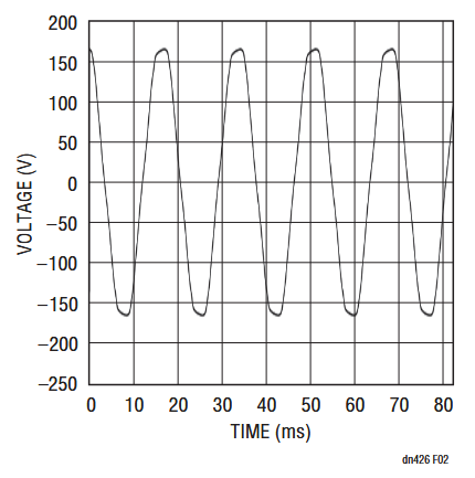 Figure 2 shows the AC line voltage in Linear Technology’s Mixed Signal lab. The flattened peaks are typical of the voltage in an office building where many of the loads are nonlinear, such as computer power supplies. Figure 3 shows the current through a 50W incandescent bulb. Figure 4 shows the current through a 15W compact fluorescent bulb, and Figure 5 is the current through a 4W LED-based bulb. The 5MHz full linear bandwidth of the LTC2351-14 allows analysis of high frequency components of the line voltage and current, limited in this case by the bandwidth of the sense transformers.