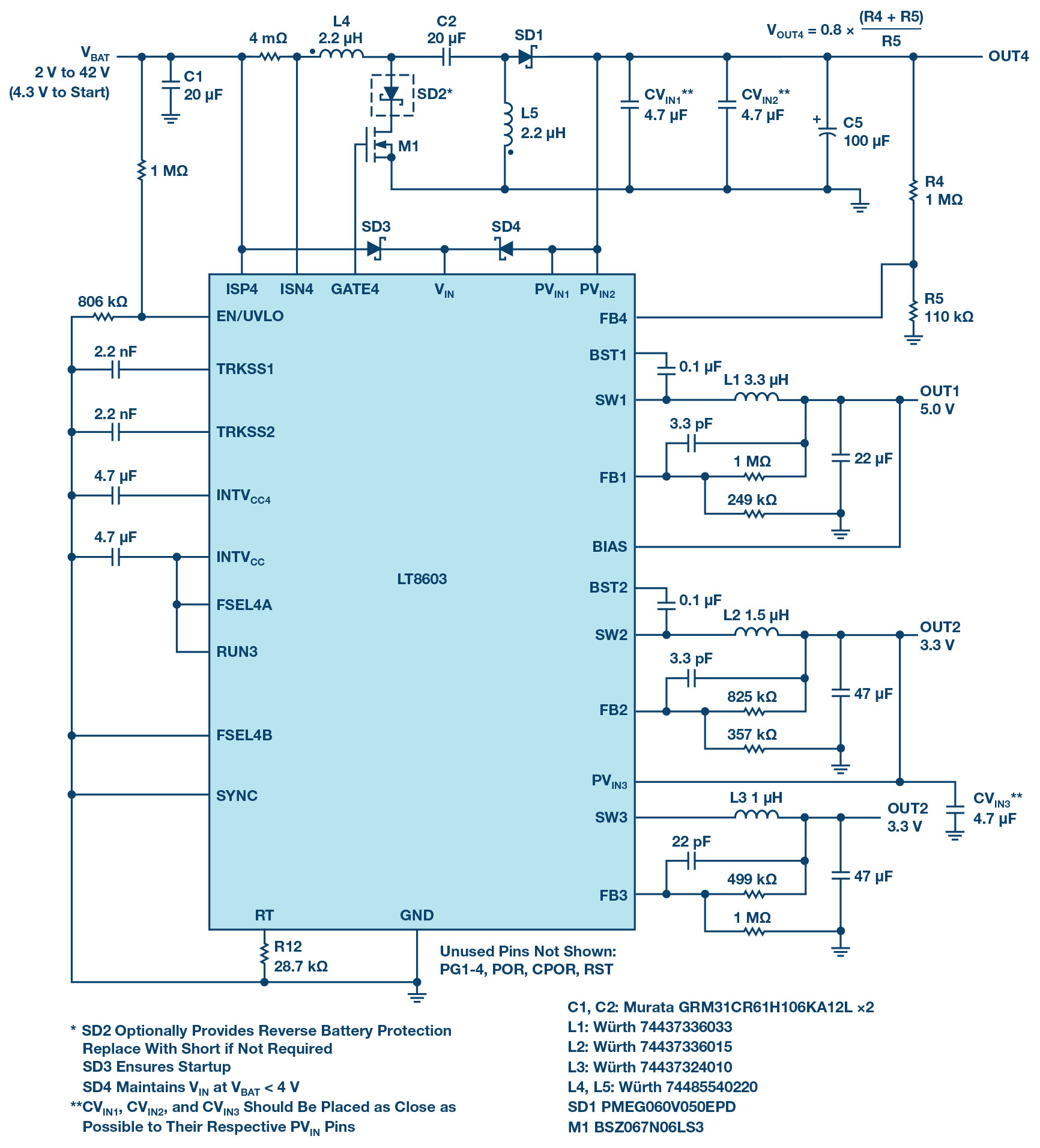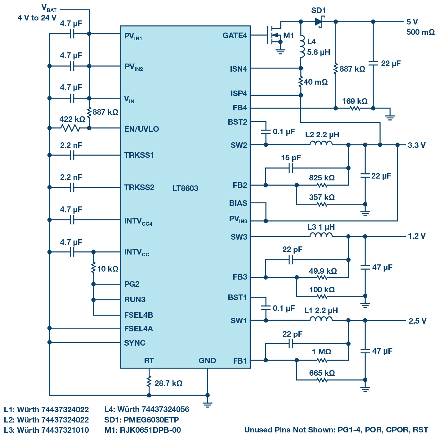 - Four regulated outputs with a fourth rail as SEPIC