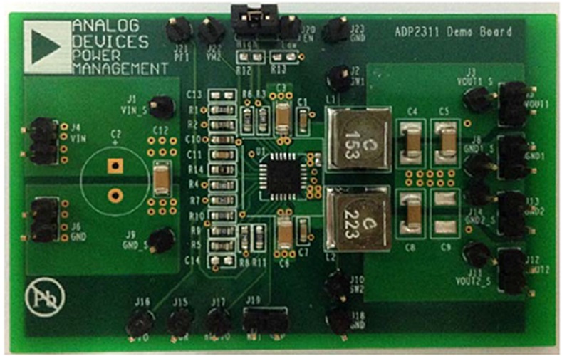 The ADP2311 evaluation board is a complete, dual, 1 A step-down regulator solution that allows users to evaluate the performance of the ADP2311 with a near ideal printed circuit board (PCB) layout.The outputs of the ADP2311 evaluation board are preset to 1.2 V and 3.3 V for Channel 1 and Channel 2, respectively. The VIN threshold of the power fail input is set at 8.99 V. Different output and power fail input voltages can be achieved by changing the appropriate passive components.