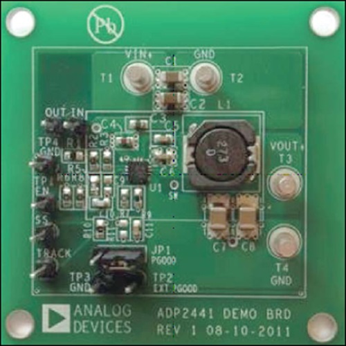 The ADP2441-EVALZ is available with 5 V at 1 A output, switching frequency set to 500 kHz. If needed, the ADP2441 evaluation board configuration can be modified by changing the values of the appropriate passive components.