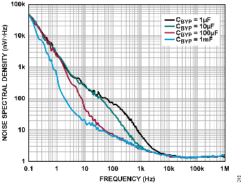 The 5 V output from the ADM7150, an ultralow noise, high PSSR, RF linear regulator, is used to maximize the gain of the HMC717A. The ADM7150 is a low dropout linear regulation with a typical output noise of 1.0 µV rms from 100 Hz to 100 kHz for fixed output voltage options and <1.7 nV/√Hz noise spectral density above 10 kHz, as is shown in Figure 14.