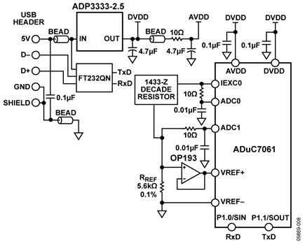 The USB interface to the ADuC7060/ADuC7061 is implemented with an FT232R UART to USB transceiver, which converts USB signals directly to the UART.