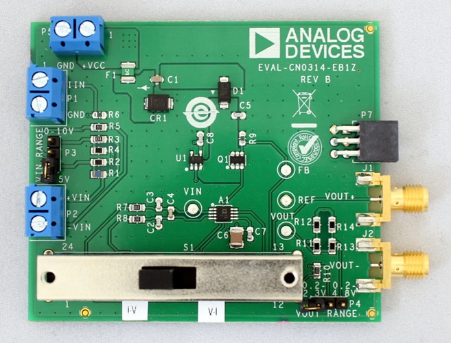 For the transmit configuration shown in Figure 1, Switch S1 should be put in the "V-I" position. Jumper P3 should be put in the "0-10V" position for an input range of 0V to 10V, and in the "0-5V" position for an imput range of 0V to 5V. See also the photo for evaluation board in Figure 9.