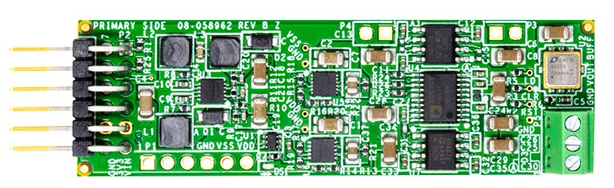 On-board power converters produce the required supply rails from a single voltage supply provided by the development platform board. Low noise, high power supply rejection ratio (PSRR) voltage regulators ensure that the switching noise is minimized. A high precision, high stability, on-board hermetically sealed voltage reference ensures the high precision and accuracy of the 20-bit system.