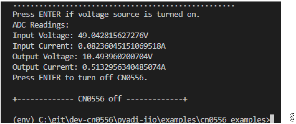 - The input and output voltage and current at the V1 and V2 will be printed in the terminal. The board will continuously regulate the output voltage to 14 V unless CN0556 is turned off.