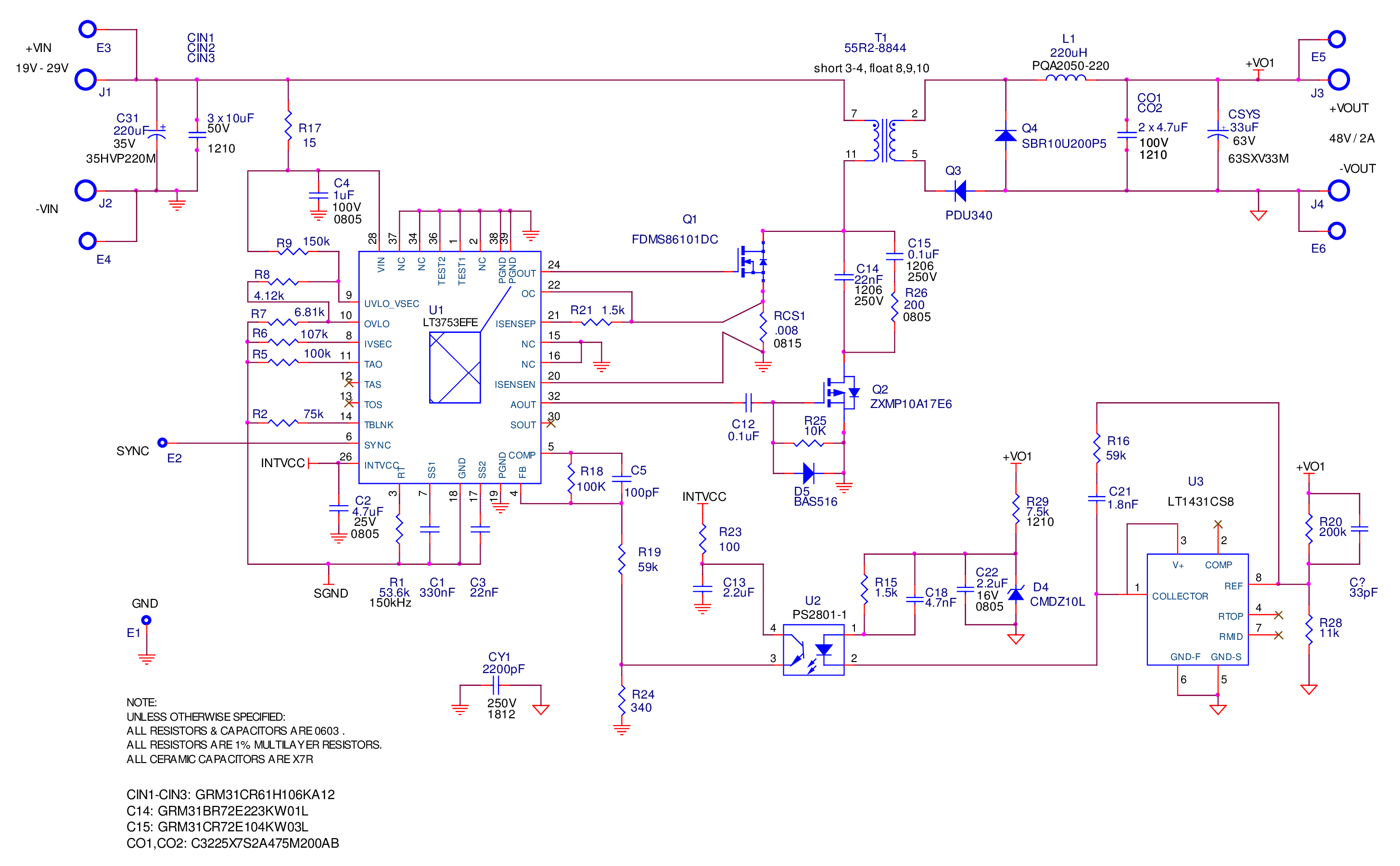 19V-29V input to 48V/2A Isolated Forward Converter using LT3753