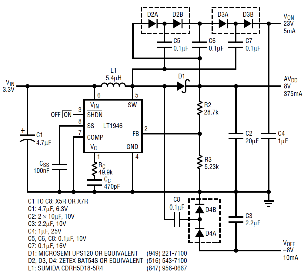 Figure 1. Low profile, triple output TFT supply (8V, -8V, 23V)