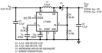 The LT1946/LT1946A is a step-up, or boost, DC/DC converter with a built-in 1.5A, 200mΩ switch. The minimum current limit of 1.5A is guaranteed over the full operating temperature range of the part, allowing high output currents to be generated, while the low 200mΩ resistance makes for efficient operation. The LT1946 switches at 1.2MHz, while the LT1946A switches at 2.7MHz, allowing the use of small, low profile inductors and capacitors. In a typical triple output TFT supply with an input voltage of 3.3V, the LT1946 can simultaneously provide a main 8V output at 375mA, a 23V output at 5mA, and a –8V output at 10mA. These outputs are generated while maintaining power conversion efficiencies as high as 83%. The higher switching frequency of the LT1946A is useful in applications where noise in the 1MHz region is unacceptable, such as DSL power supplies and automotive LED dash board backlights. Both parts include an integrated soft-start function to keep the start-up inrush current well controlled. The LT1946 comes in the space saving MSOP-8 package with a maximum height of 1.1mm, and the LT1946A comes in a MSOP-8E thermally enhanced package.