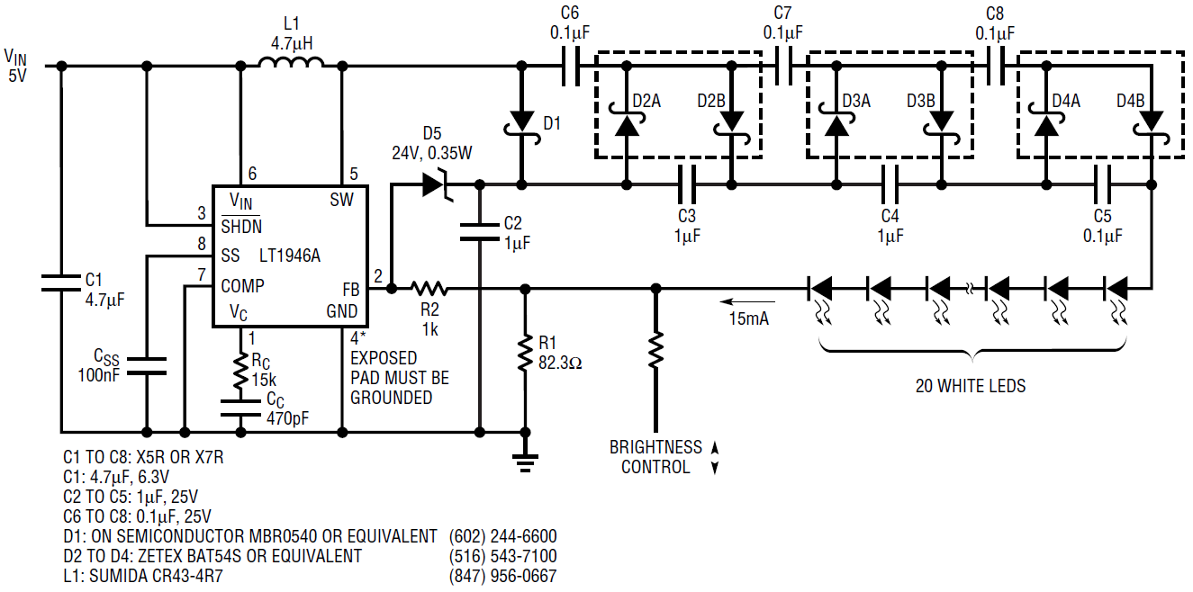 In automotive applications, the 2.7MHz switching frequency of the LT1946A ensures that any power supply noise is above the AM band. Figure 7 shows the LT1946A driving 20 LEDs from a 5V input. All LEDs are in series guaranteeing equal current sharing and uniform brightness.