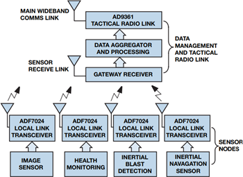 The number of potential sensors and the volume of data that is generated will require that wireless interconnections are used, requiring short range data links to aggregate the data before it is relayed by the tactical radio back to the command center; enabling the warfighter to be monitored and better supported by the command structure.