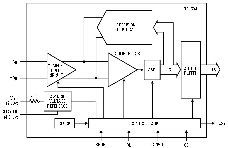 To achieve 333ksps with outstanding AC and DC performance at the 16-bit level, careful design is required. Figure 1, the LTC1604 block diagram, illustrates the design of this part. A high performance differential sample-and-hold circuit, combined with an extremely fast successive-approximation ADC and an on-chip reference, delivers an excellent combination of AC and DC performance. A digital interface allows easy connection to microprocessors, FIFOs or DSPs.