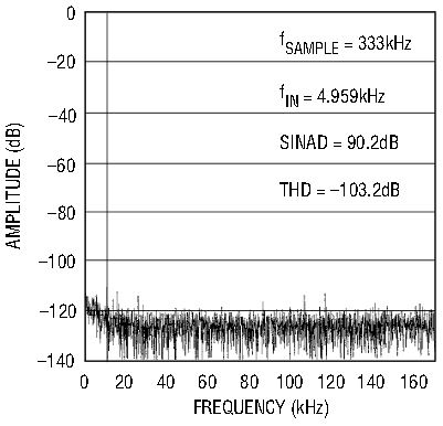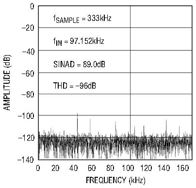 The sample-and-hold circuit determines the dynamic performance of the ADC. The LTC1604 has a wide bandwidth, very low distortion, differential sample-and-hold. Fast Fourier transform (FFT) test techniques are used to test the LTC1604’s frequency response, distortion and noise at the rated throughput. By applying a low distortion sine wave and analyzing the digital output using an FFT algorithm, the ADC’s spectral content can be examined for frequencies other than the fundamental. Figures 4 and 5 show the excellent AC performance of the LTC1604 at 333ksps with fIN = 5kHz and 100kHz, respectively. The AC performance of the LTC1604 include total harmonic distortion of –100dB for a 5kHz input and –94dB for a 100kHz input and an input bandwidth of 15MHz for the sample-and-hold.