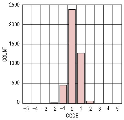 The noise of an ADC can be evaluated in two ways: by signal-to-noise ratio (SNR) in the frequency domain and by histogram in the time domain. The LTC1604 excels in both. Figure 4 demonstrates that the LTC1604 has a SNR of over 90dB in the frequency domain. The noise in the time-domain histogram is the transition noise associated with a high resolution ADC, which can be measured with a fixed DC signal applied to the input of the ADC. The resulting output codes are collected over a large number of conversions. The shape of the distribution of codes will give an indication of the magnitude of the transition noise. In Figure 6, the distribution of output codes is shown for a DC input that has been digitized 4096 times. The distribution is Gaussian and the RMS code transition noise is about 0.66LSB. This corresponds to a noise level of 90.9dB relative to full scale. When added to the theoretical 98dB of quantization error for a 16-bit ADC, this yields an SNR of 90.1dB, which correlates very well with the frequency domain measurements.