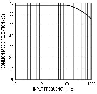 Figure 7a depicts a typical single-ended sampling system with ground noise, which may be 60Hz noise, digital clock noise or some other type of noise. When a single-ended input is used, the ground noise adds directly to the input signal. By using the differential inputs of the LTC1604 the ground noise can be rejected by connecting the inputs directly across the signal of interest, as shown in Figure 7b. Ground noise becomes “common mode” and is rejected internally by the LTC1604 by virtue of its excellent common mode rejection ratio (CMRR). Figure 8 shows the CMRR of the LTC1604 versus frequency. Notice that the CMRR is constant over the entire Nyquist bandwidth and is only 6dB lower at 300kHz. This ability to reject high frequency common mode signals is very helpful in sampling systems, where noise often has high frequency components due to switching transients.