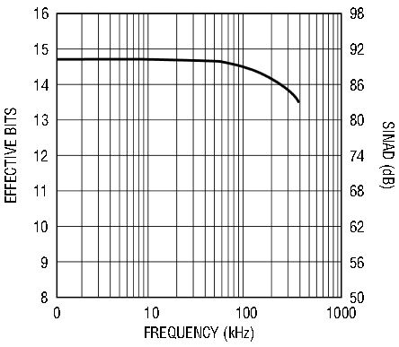 Figure 9. The LTC1604 has essentially flat SINAD and effective bits out to Nyquist.