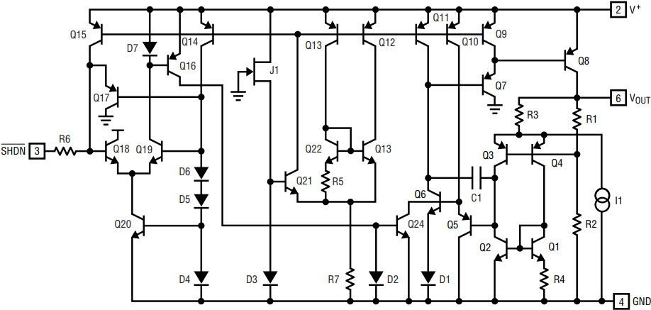 At the heart of the LT1461 is the bandgap core: Q1, Q2, Q3 and Q4 of Figure 1. Q1 and Q2 generate a ∆VBE, whereas Q3 and Q4 provide the attendant VBE. The bandgap voltage is impressed across R1, and R2 provides gain for numerous voltage options. I1 provides patented curvature compensation that modifies the ∆VBE current and greatly improves the temperature coefficient. High output current and excellent load regulation are the result of careful layout techniques and four betas of current gain from Q5 through Q8. The LT1461 has a shutdown control that can be used to turn off the reference during high output current conditions; it also has thermal shutdown or current-limit protection for the device during overload. Table 1 summarizes the performance specifications of the new reference.