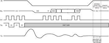Interfacing to the LTC2408 is simple. The individual CS and CLK signals (see Figure 6) can be common to both the ADC and multiplexer or driven independently to allow separate control of the ADC and the mux. DIN is serially programmed to select the desired input channel; SDO is the serial output data of the converter. DIN and SDO may be shared by using an external driver with a high impedance output state. Since the LTC2408 exhibits single-cycle settling, there is no overhead associated with digital filter settling time. At the conclusion of each conversion, a new channel may be selected by a 4-bit serial input word, or the same channel can be retained by not shifting in a new word. A new input channel may be selected up to 66ms after the data-output read has been completed. This 66ms period may be used to allow the input signal to settle or offer the user flexibility in the timing of the mux channel selection.