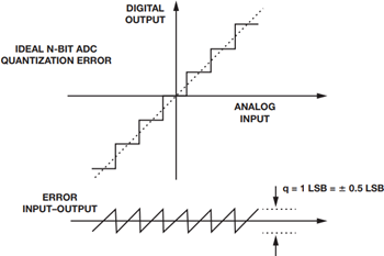 First, note that since ADCs are not ideal and don’t have infinite resolution, they can only display a finite amount of representations on their output. The number of representations is determined by the input full scale of the converter divided by 2N representations, N being the number of bits the converter has ideally.
