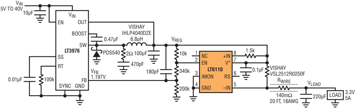 Figure 2 shows a complete cable/wire voltage drop compensation system consisting of a 3.3V, 5A buck regulator and an LT6110, which regulates the voltage of a remote load connected through 20 feet of 18 AWG copper wire. The buck regulator’s 5A output requires the use of an external RSENSE.