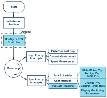 The PFC controller manages the control and monitoring of the boost PFC circuit. These tasks are offloaded from the main motor control software workflow into low priority routines as shown in Figure 6. The PFC controller parameters are configured during startup. This step can typically be skipped by writing the configuration parameters to EEPROM memory on the controller IC, if such a feature is available. As shown in Figure 6, in a typical motor control system, the speed and current measurements along with the PWM controller updates will be handled within high priority interrupts, in which the current measurement is synchronized with the PWM signal. The PFC controller can be set up to handle the input side measurements, such as input ac line voltage and current, dc bus voltage, input power, and PFC circuit temperature. These measurements are not critical to the motor control algorithm, with the possible exception of the dc bus voltage measurement in a sensorless algorithm. They are, however, important to the overall system-level monitoring and controller optimization. Thus, they can be requested and handled within a low priority I2C data handling task or interrupt routine, and at a scheduling rate matched to the system monitoring time constant.