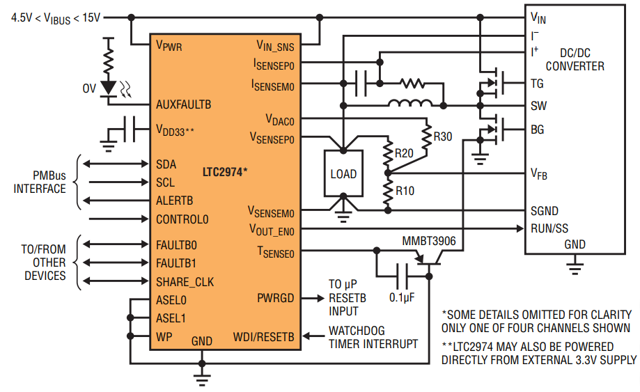 Using the LTC2974, system health can be determined from the voltage, current and temperature status registers, while the multiplexed, 16-bit ∆∑ ADC monitors input and output voltages, output currents, and internal and external diode temperatures.
