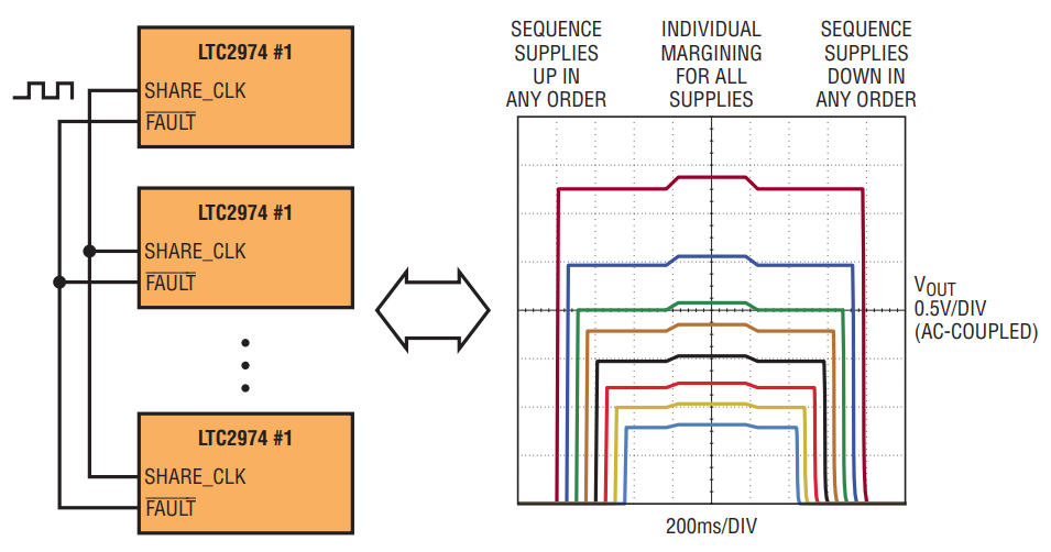 The LTC2974 simplifies the sequencing of any number of supplies. By using a time-based algorithm, users can dynamically sequence supplies on and off in any order. Sequencing across multiple LTC2974s is also possible using the 1-wire share-clock bus and one or more of the bidirectional fault pins (see Figure 2). This approach greatly simplifies system design because channels can be sequenced in any order, regardless of which LTC2974 provides control. Additional LTC2974s can be added at any time without concern for system constraints, such as a limited supply of daughter-card connector pins.