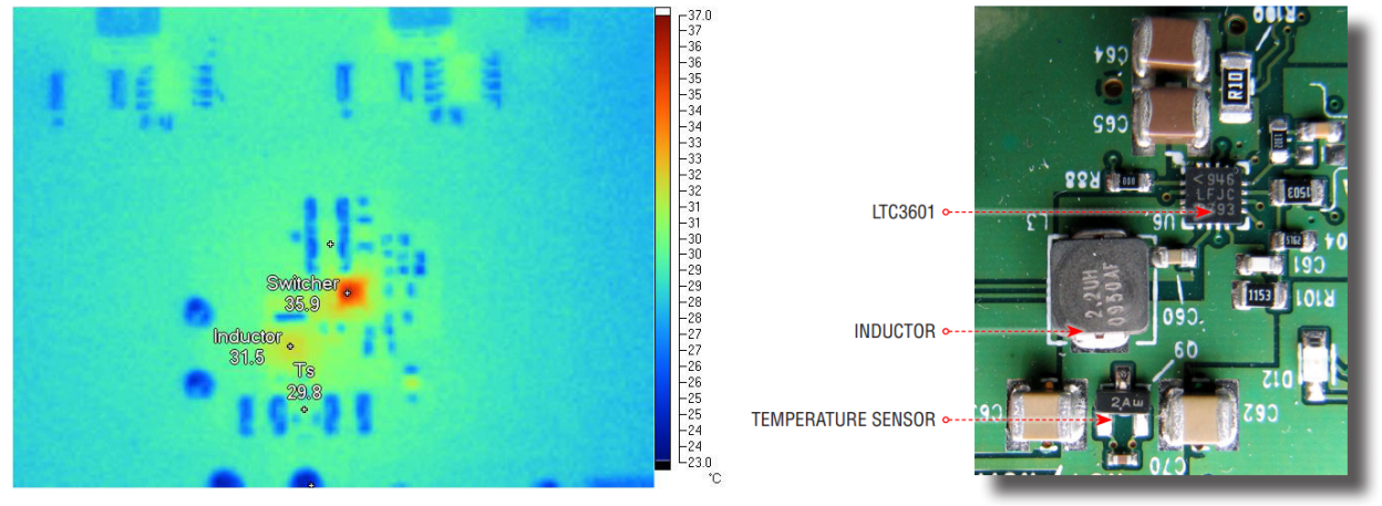 Figure 4. Thermal image of a DC/DC converter showing the difference between the actual inductor temperature and the temperature sensing point.