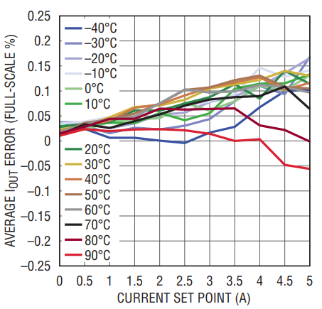 Figure 6. Total current measurement error of the LTC2974 for a DC/DC converter across the full range of temperature and output current.