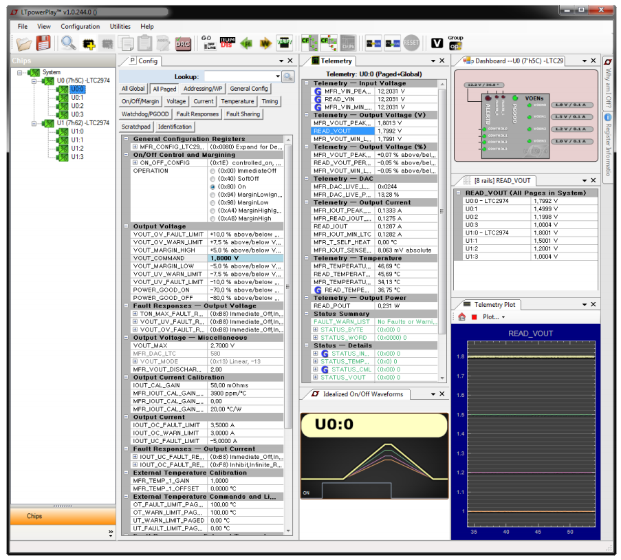 The easy-to-use PC-based LTpowerPlay software allows users to configure the LTC2974 via a USB interface and a dongle card. LTpowerPlay software, which is free and downloadable, takes much of the coding out of the development process and improves time-to-market by allowing the designer to configure all device parameters within an intuitive framework.