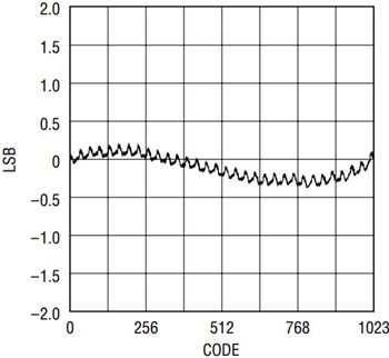 The LTC1661 uses a patented architecture that guarantees monotonicity over the full industrial temperature range. Differential nonlinearity (DNL) is typically ±0.1LSB (±0.75 max) (see Figures 4 and 5).