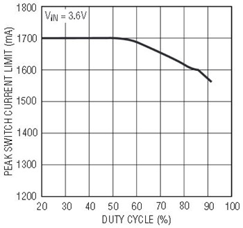 Figure 8. Typical peak switch current limit drops as duty cycle increases above 50%.