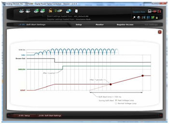 Since experienced power design engineers typically are not excellent code programmers, the approach of this PFC solution is to reduce the digital aspect of the circuit to an easy to use graphical user interface (GUI). Figure 2 shows a screenshot of the software. All parameters that can be influenced are graphically shown on the different setup and monitoring screens. This way, evaluating and programming the ADP1047 and ADP1048 offers additional safety since the internal state machine of the chips reduces the room for user errors compared to programming a general microcontroller or digital signal processor.