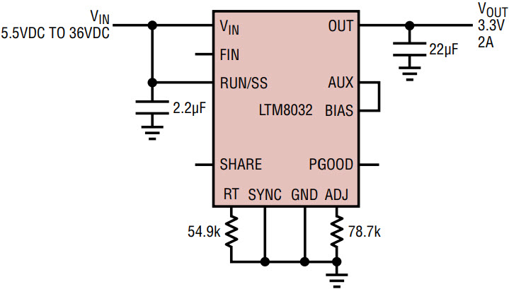 Figure 1. Just two resistors, input and output caps are needed to complete a power supply design with the LTM8032.
