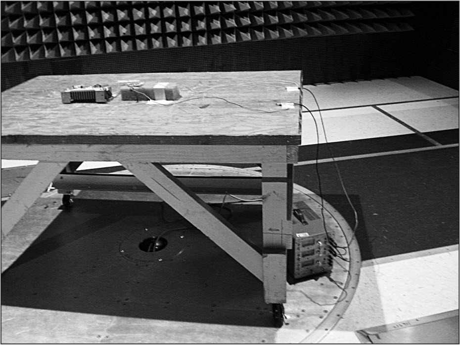 Figure 2. For EMI testing, the DUT is mounted on a circuit board and placed on a wooden table. The power source is on the floor.
