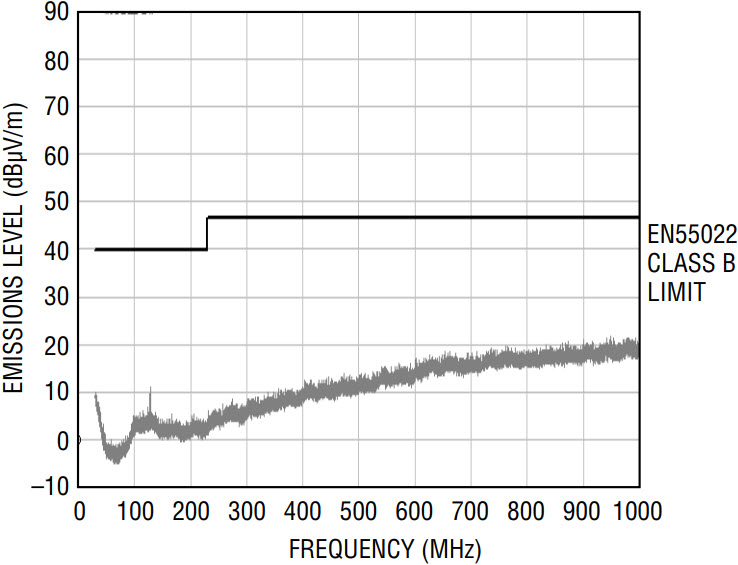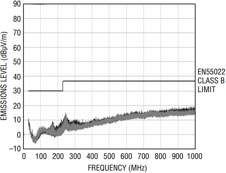 The LTM8032 switching step-down regulator is both easy to use and quiet, meeting the radiated emissions requirements of CISPR22 and EN55022 class B by a wide margin.
